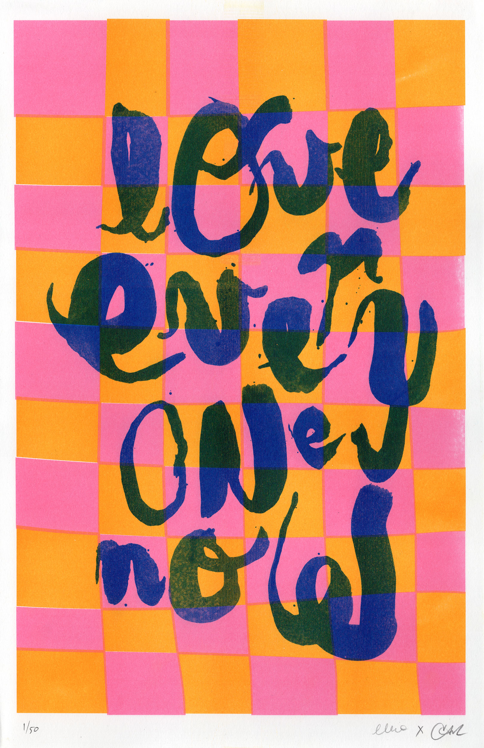 A vibrant collaboration between myself and Brooklyn-based risograph artist Ellie Martin, created during their time together at Parsons School of Design. This limited edition print combines hand-painted letterforms with bold neon patterns in pink and gold, creating a checkerboard rhythm that pulses with optimism. More than a question, “What Now?” serves as a loving directive: an invitation to spread positivity amidst chaos.